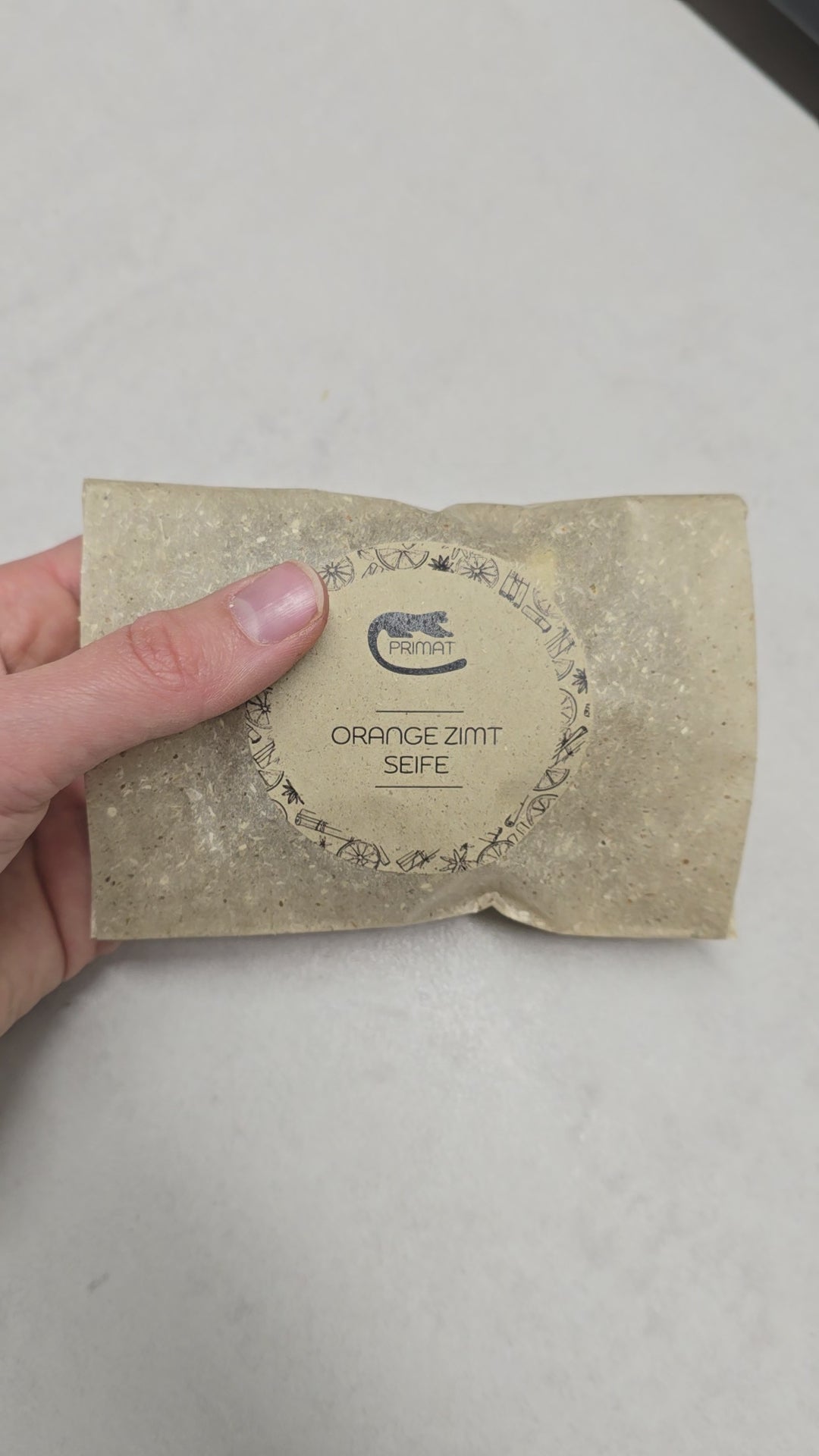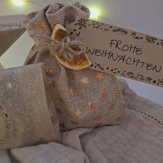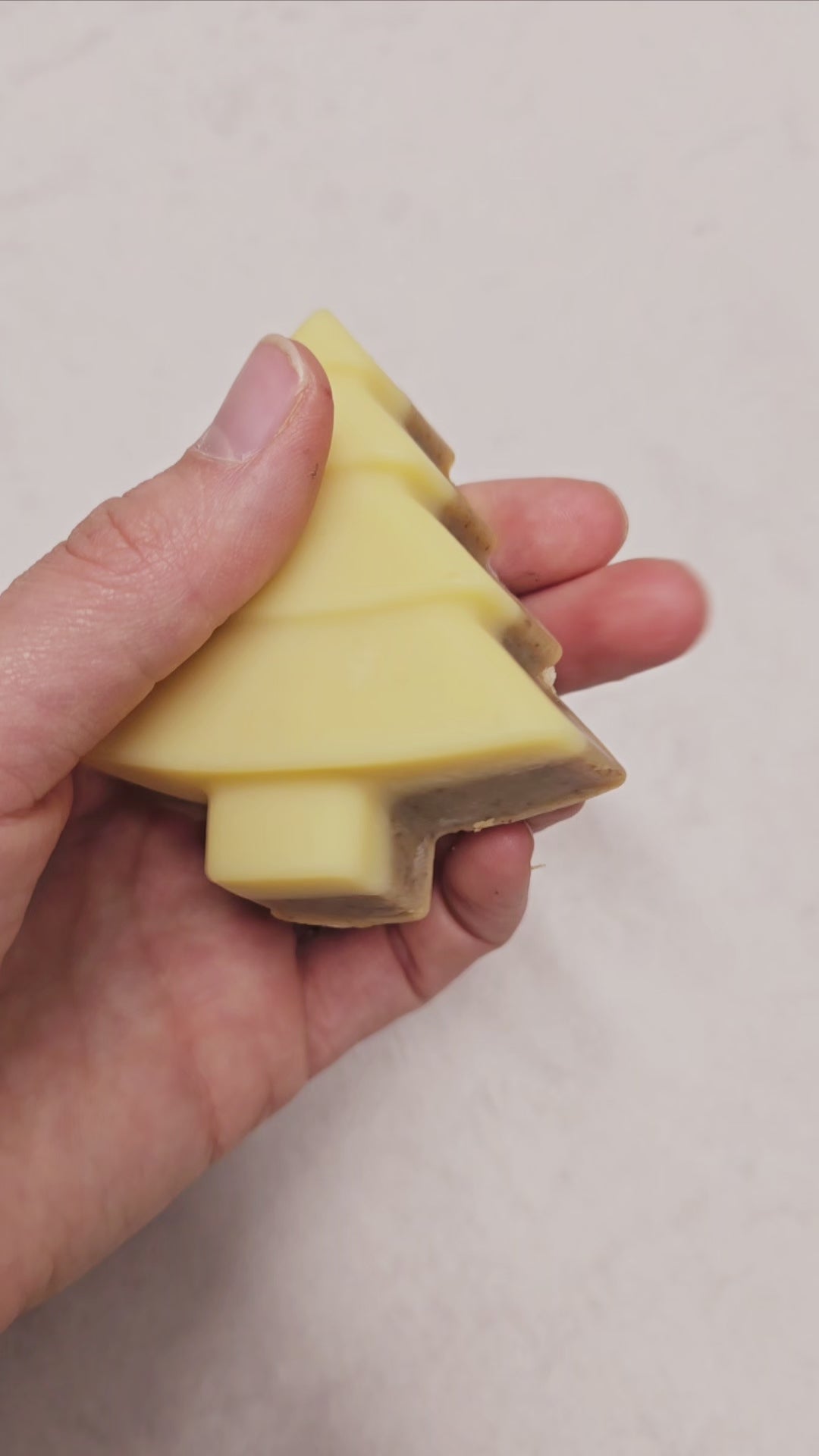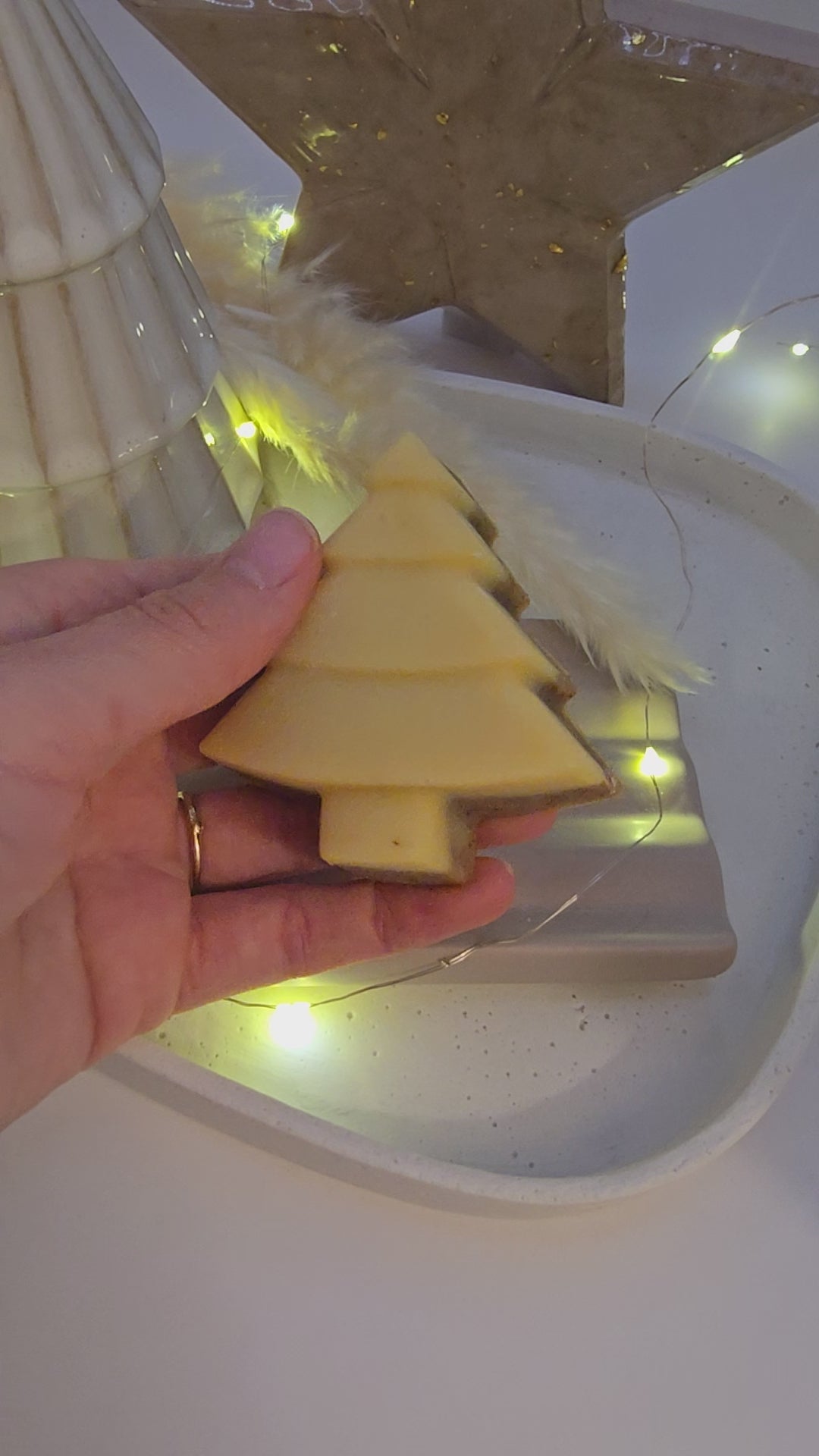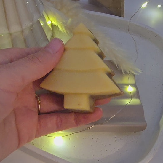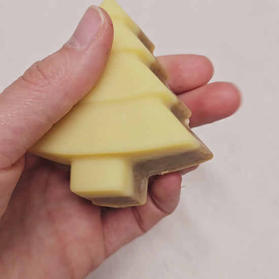 Unsere Weihnachtsseife "Orange-Zimt" ist in einer kleinen süßen Tannenbaumform erhältlich.