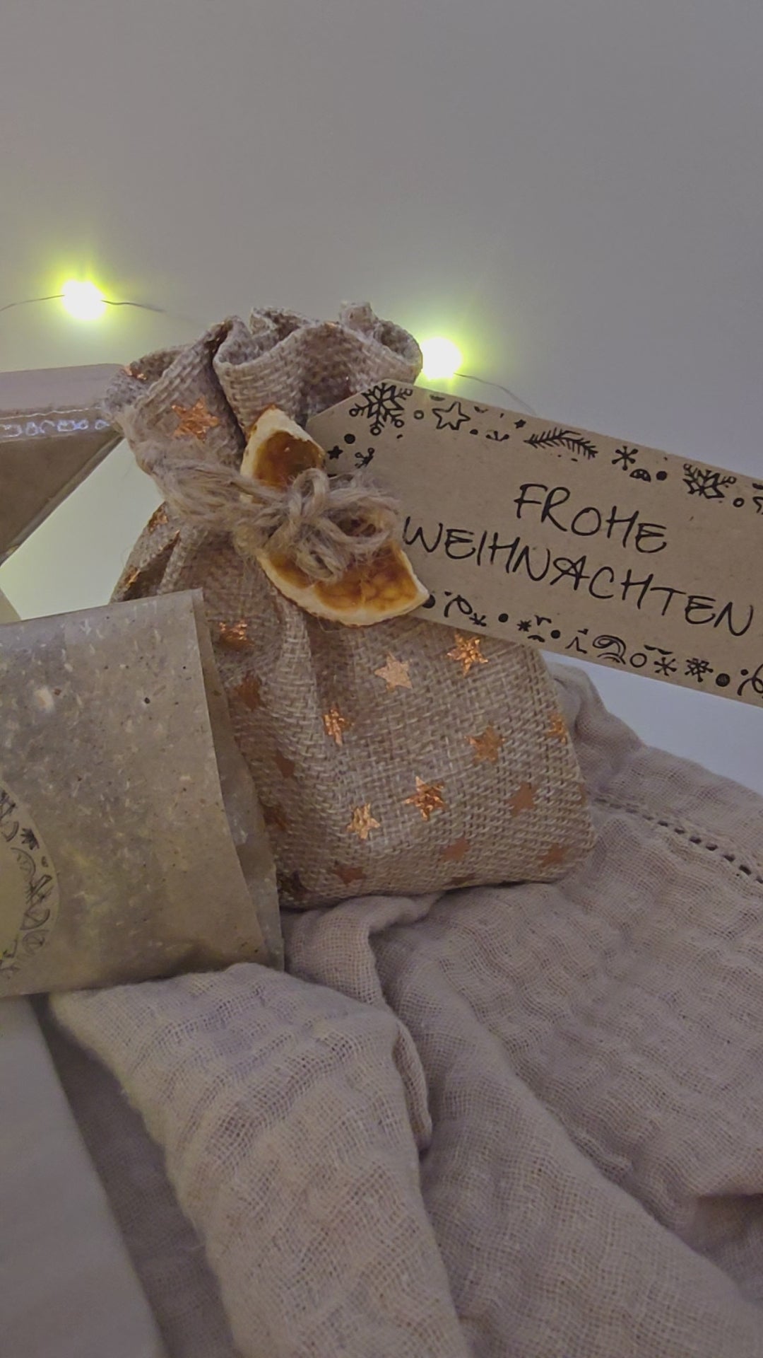 Unsere Weihnachtsseife "Orange-Zimt" verwöhnt deine Haut mit reichhaltiger Sheabutter sowie pflegendem Kokos- und Aprikosenkernöl. Der gemahlene Zimt sorgt nicht nur für farbige Abwechslung, sondern für einen zarten Peeling- und tollen Dufteffekt. Die Kombination der ätherischen Öle aus Nelken, Zimt und Orangen sorgen für ein wohlig warmes weihnachtliches Gefühl.